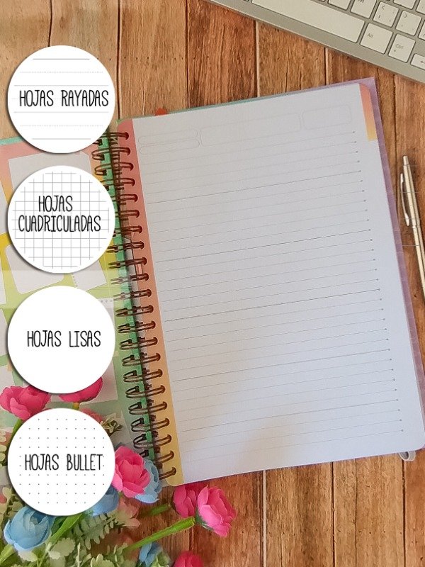 ✓ 84 hojas de 90grs. divididas por 6 colores - rayadas, cuadriculadas o punteadas estilo bullet.