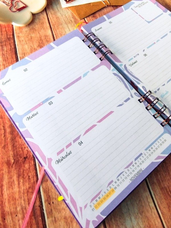 En el interior vas a tener la semana en dos páginas para que al abrirla la puedas visualizar fácilmente, calendario del mes en el que estas, destacado e importante de la semana!