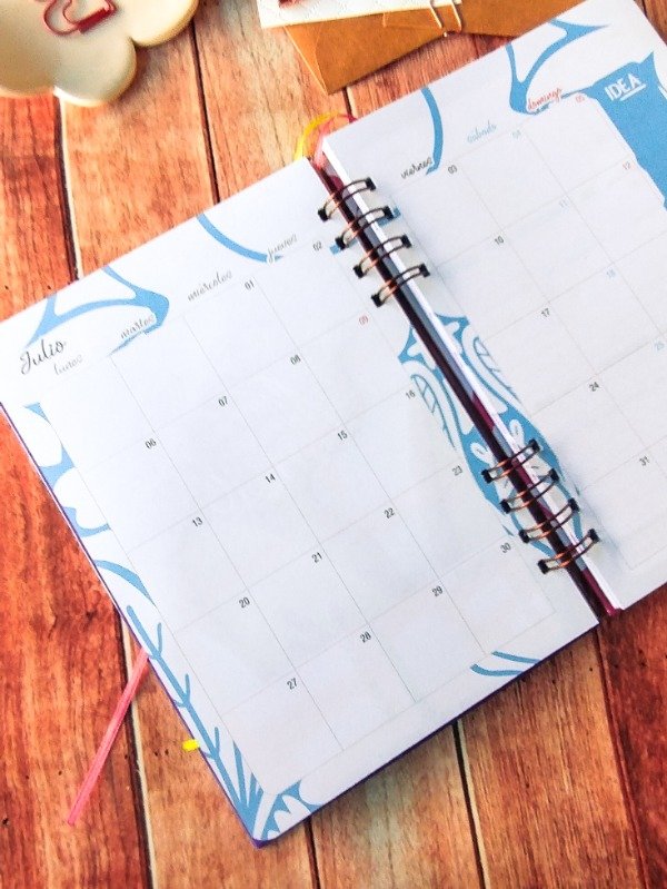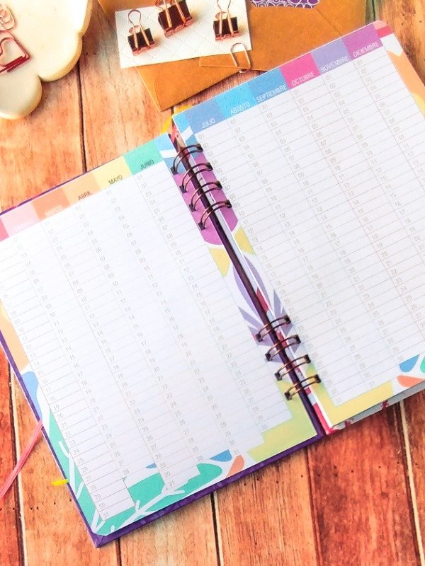 En el interior vas a tener un día por hoja, con excepción de los fines de semana que comparten página, calendario del mes en el que estás, espacio para la lista del día, ideas, destacados y más!